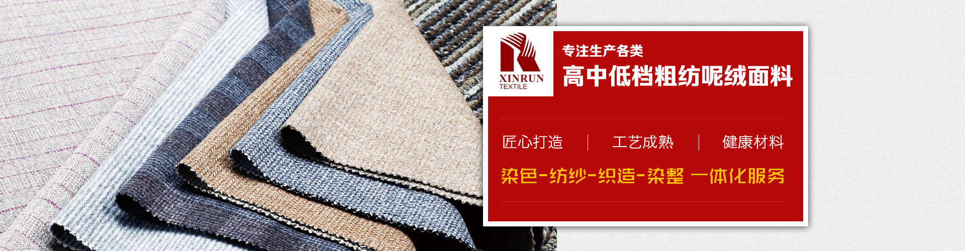 主要產(chǎn)品有:法蘭絨、麥爾登,立絨,順毛,兔羊絨,阿爾帕卡,雙面呢,格呢,斜紋呢、圈圈呢、針織毛呢,臺(tái)球呢和地毯等幾百個(gè)品種以及上千個(gè)花色,另外新開發(fā)特種花式紗面料、復(fù)合,印花,扎染,涂層,貼膜,防水,防靜電等各類功能型面料。